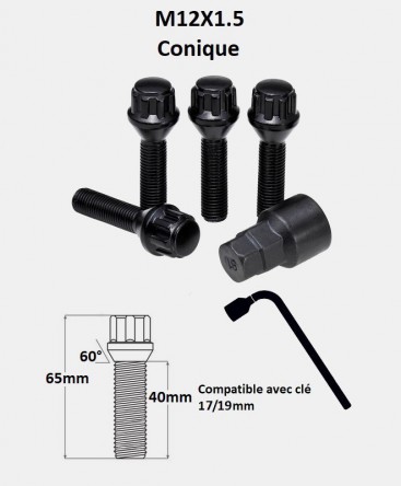 | Dimensions | Diamètre : M12 / Pas filetage : 1.5 / Portée : assise conique (60° ) / Hauteur totale : 65mm / Hauteur sous assise (longueur du filetage) : 40mm |