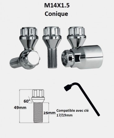 Set de 4 ou 5 vis de roues antivol monobloc ultrarésistantes à empreintes codées + 1 ou 2 douilles de montage/démontage en acier forgé taille M14X1.5/longueur totale 49mm/longueur filetée 25mm/assises coniques 60° | Au choix.