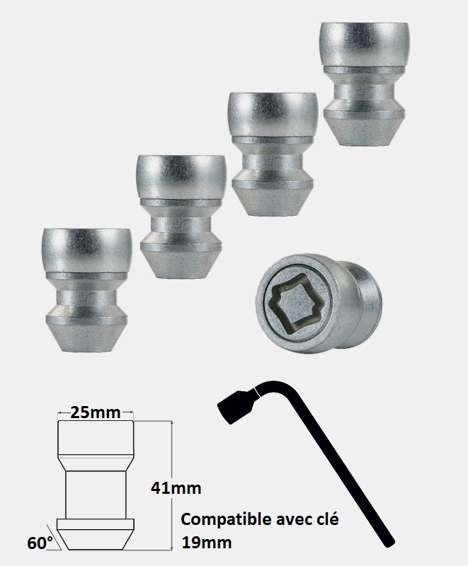 Écrous antivol de roues longs M14X1.5 assise conique 60°