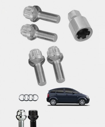 Set de 4 écrous de roues antivol monobloc ultrarésistants à empreintes codées + 1 douille de montage/démontage en acier forgé spécifique à votre Audi A2 (8Z) 1999, 2000, 2001, 2002, 2003, 2004 et 2005 | Compatible tous modèles, finitions, jantes et motorisations disponibles.