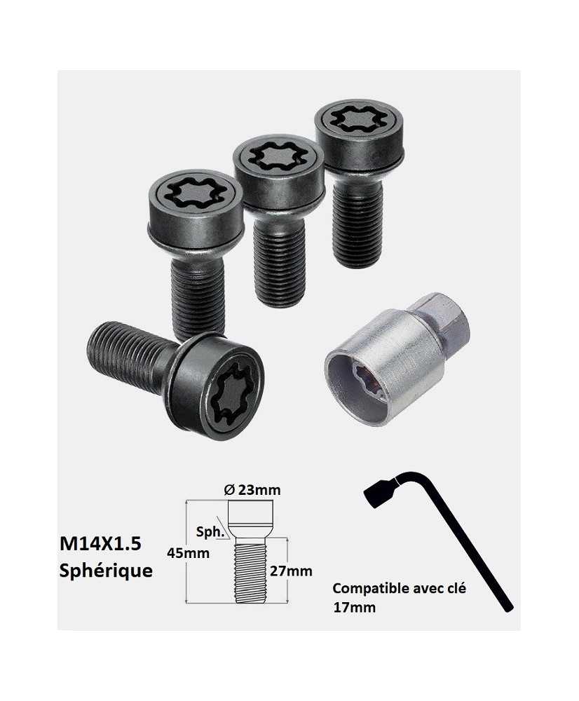 | Contenu | 4 boulons antivols codés (haute sécurité) + 1 ou 2 clef(s) de montage/démontage + 1 coffret de rangement + 1 sticker mémo avec numéro d'empreinte |