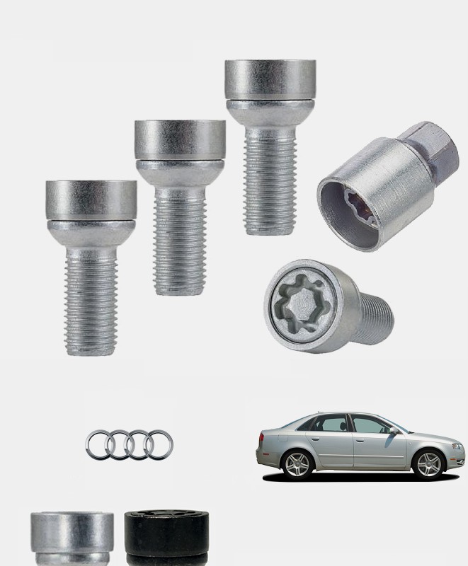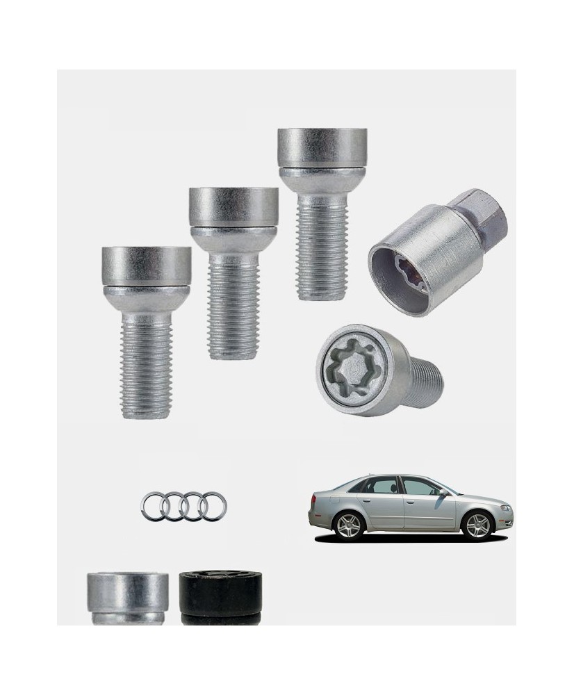 Approuvées par les principaux constructeurs automobiles ces 4 vis antivol haute sécurité sont conçues dans un acier de qualité, forgées à froids et affichent une classe de résistance de 10,9. Soigneusement zinguées en coloris argent ou noir mat afin de leur conférer une finition et une durabilité exemplaire, elles sont spécifiques à votre Audi A4 troisième génération (B7) quelle que soit sa date de mise en circulation, sa version (y compris S4, RS4, Berline, Break Avant ou Cabriolet, etc.), son niveau de finition (Ambition, Advance Edition, Ambition Luxe, Attraction, Pack Plus, Ambiente, Exclusive Line, S-Line, etc.), son type de jantes et sa motorisation (1.6, 1.8 Turbo 20V, 2.0 20V, 2.0 TFSi, 3.2 FSi, 4.2 V8, 1.9 TDI, 2.0 TDI, 2.5 TDI, 2.7 TDI, 3.0 TDI, etc.).