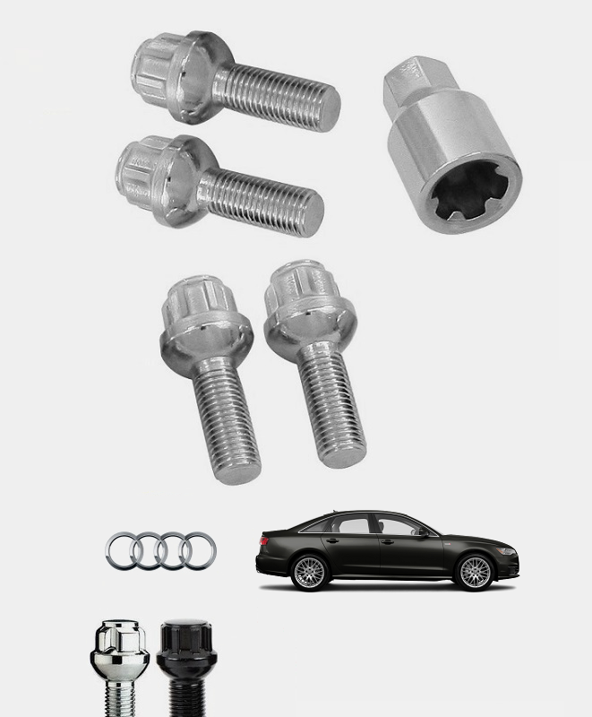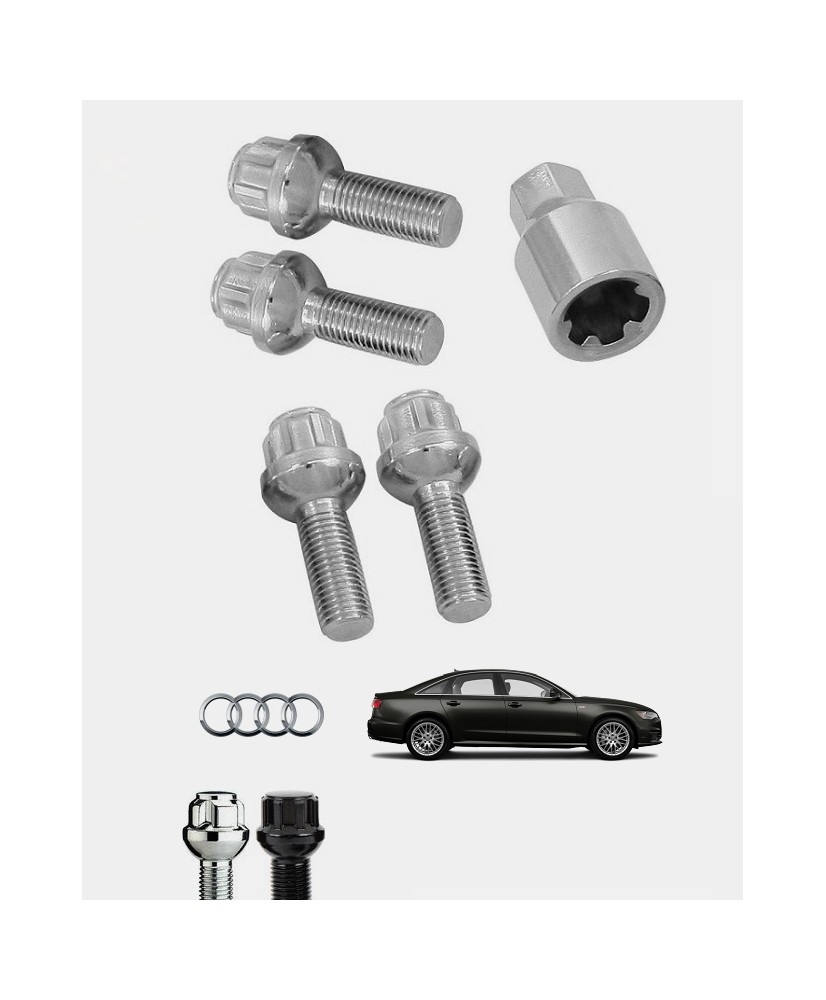 Set de 4 écrous de roues antivol monobloc ultrarésistants à empreintes codées + 1 douille de montage/démontage en acier forgé spécifique à votre Audi A6 (C7) 2011, 2012, 2013, 2014, 2015, 2016, 2017 et 2018 | Compatible tous modèles, finitions, jantes et motorisations disponibles.