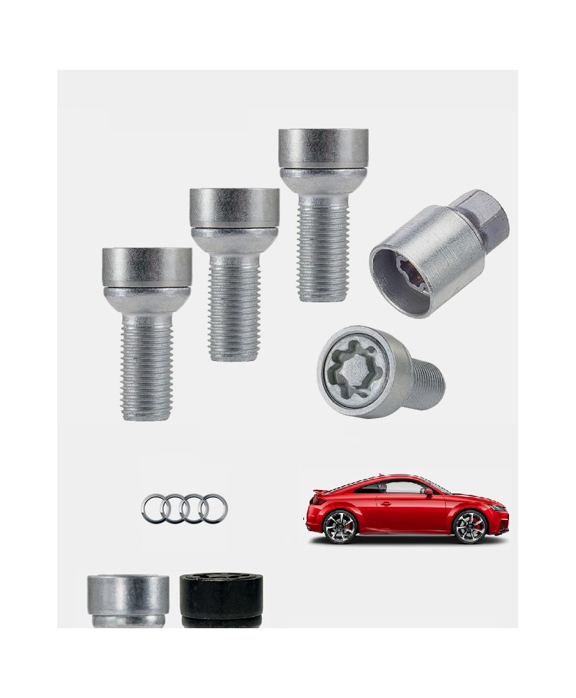 Set de 4 boulons de roues antivol ultrarésistants à empreintes codées (version haute sécurité) + 1 ou 2 douille(s) de montage/démontage en acier forgé à froid spécifique à votre Audi TT MKIII (8S) 2014, 2015, 2016, 2017, 2018, 2019, 2020, 2021, 2022 et 2023 | Compatible tous modèles, finitions, jantes et motorisations et disponibles en coloris argent ou noir galvanisé.