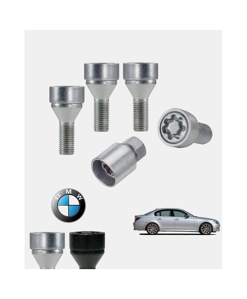 Set de 4 boulons de roues antivol ultrarésistants à empreintes codées (version haute sécurité) + 1 ou 2 douille(s) de montage/démontage en acier forgé à froid spécifique à votre Bmw Série 5 (E60) 2003, 2004, 2005, 2006, 2007, 2008, 2009 et 2010 | Compatible tous modèles, finitions, jantes et motorisations et disponibles en coloris argent ou noir galvanisé.
