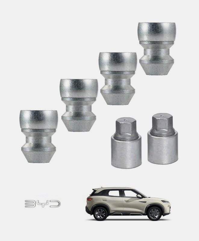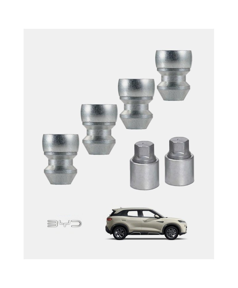 Set de 4 écrous de roues antivol ultrarésistants à empreintes codées (version haute sécurité) + 1 ou 2 douille(s) de montage/démontage en acier forgé à froid spécifique à votre BYD Atto 2 2025 et 2026 | Compatible tous modèles, finitions, jantes et motorisations et disponibles en coloris argent galvanisé.