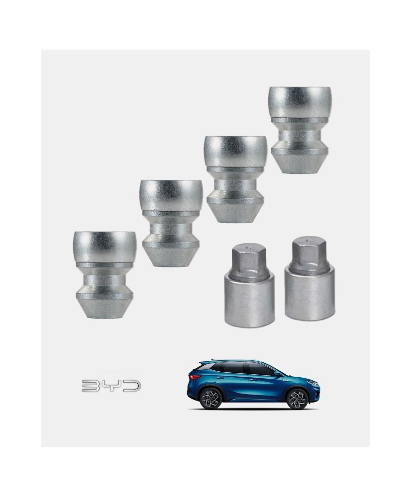 Set de 4 écrous de roues antivol ultrarésistants à empreintes codées (version haute sécurité) + 1 ou 2 douille(s) de montage/démontage en acier forgé à froid spécifique à votre BYD Atto 3 2022, 2023, 2024, 2025 et 2026 | Compatible tous modèles, finitions, jantes et motorisations et disponibles en coloris argent galvanisé.