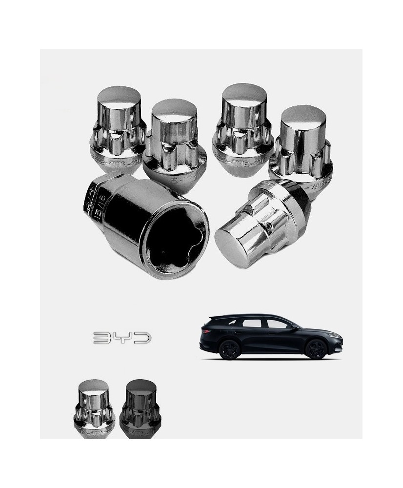 Set de 4 écrous de roues antivol monobloc ultrarésistants à empreintes codées + 1 douille de montage/démontage en acier forgé spécifique à votre BYD Seal 6 DM-i Touring 2025 et 2026 | Compatible tous modèles, finitions, jantes et motorisations disponibles.