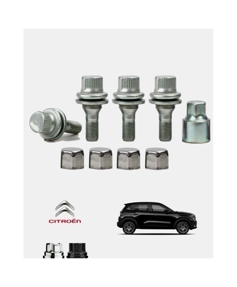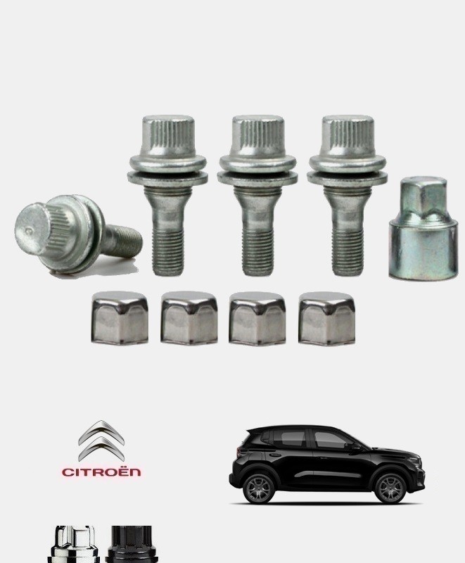 Set de 4 vis de roues antivol monobloc ultrarésistantes à empreintes codées (version haute sécurité) + 1 ou 2 douille(s) de montage/démontage en acier forgé spécifique à votre Citroën 3 quatrième génération 2024 et 2025 | Compatible tous modèles, finitions, jantes et motorisations | Disponibles en coloris argent ou noir galvanisé.