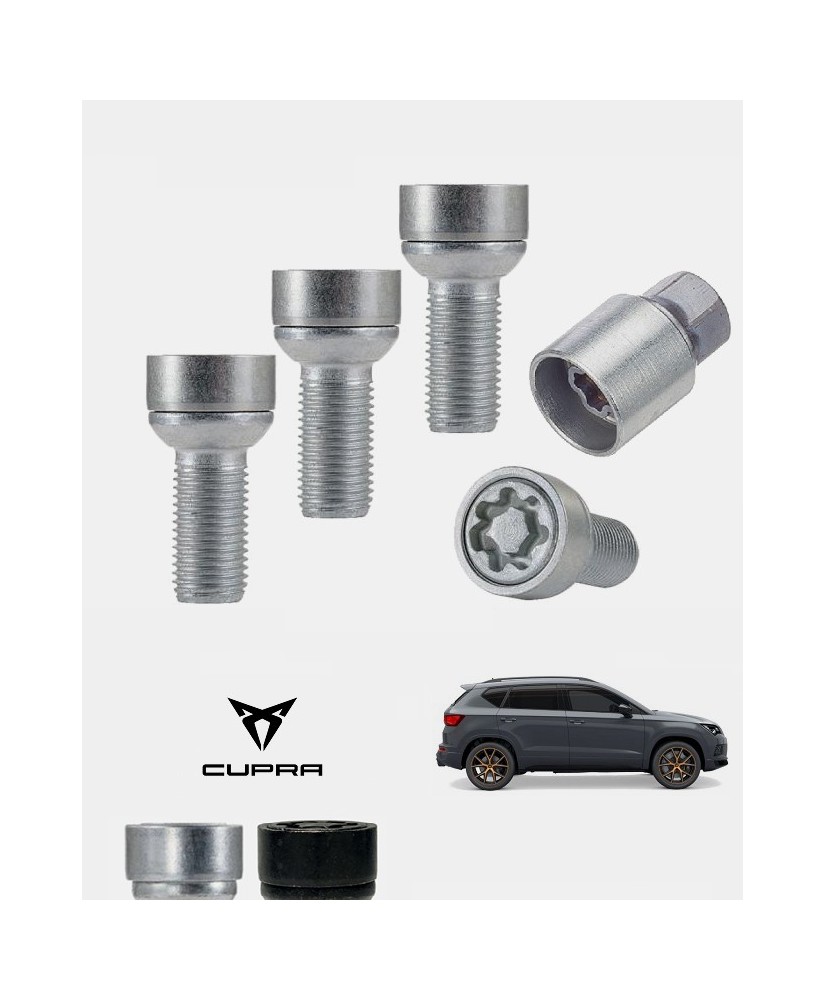 Approuvées par les principaux constructeurs automobiles ces 4 vis antivol haute sécurité sont conçues dans un acier de qualité, forgées à froids et affichent une classe de résistance de 10,9. Soigneusement zinguées en coloris argent ou noir mat afin de leur conférer une finition et une durabilité exemplaire, elles sont spécifiques à votre Cupra Ateca quelle que soit sa date de mise en circulation (Phase 1 ou phase 2), sa version, son niveau de finition (Cupra, Cupra Edition Limitée, V, VZ, etc.), son type de jantes et sa motorisation (1.5 TSi ou 2.0 TSi).