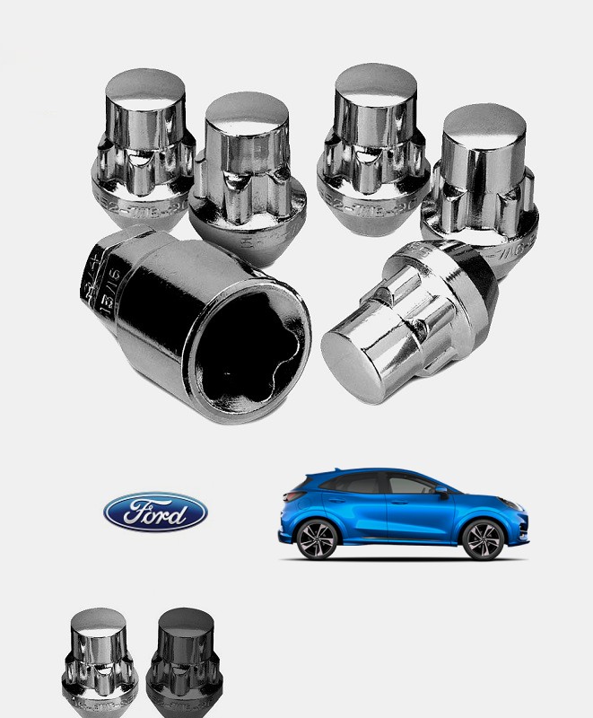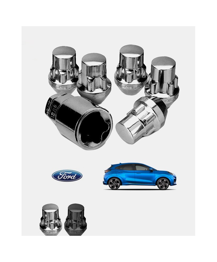 Set de 4 écrous de roues antivol monobloc ultrarésistants à empreintes codées + 1 ou 2 douille(s) de montage/démontage en acier forgé spécifique à votre Ford Puma II 2019, 2020, 2021, 2022, 2023, 2024 et 2025 | Compatible tous modèles, finitions, jantes et motorisations | Disponibles en coloris chrome ou noir.