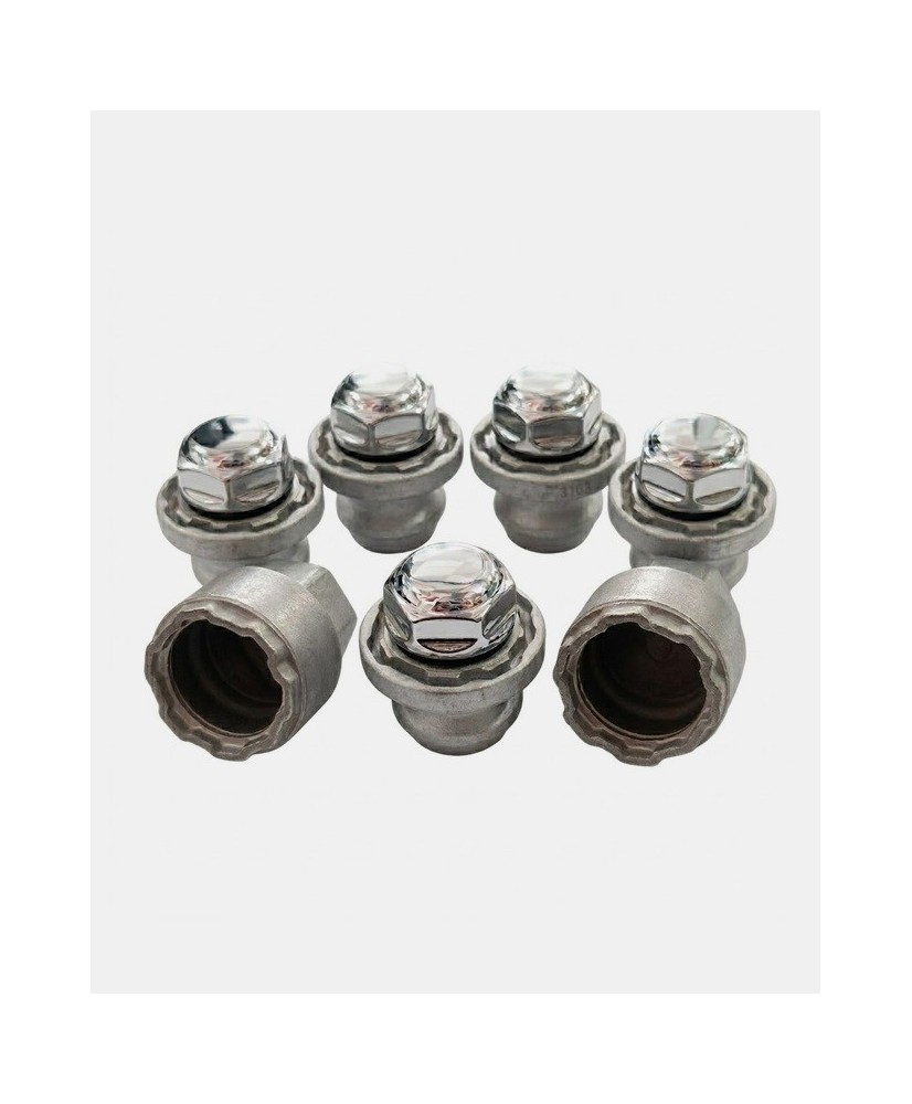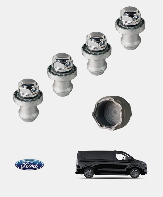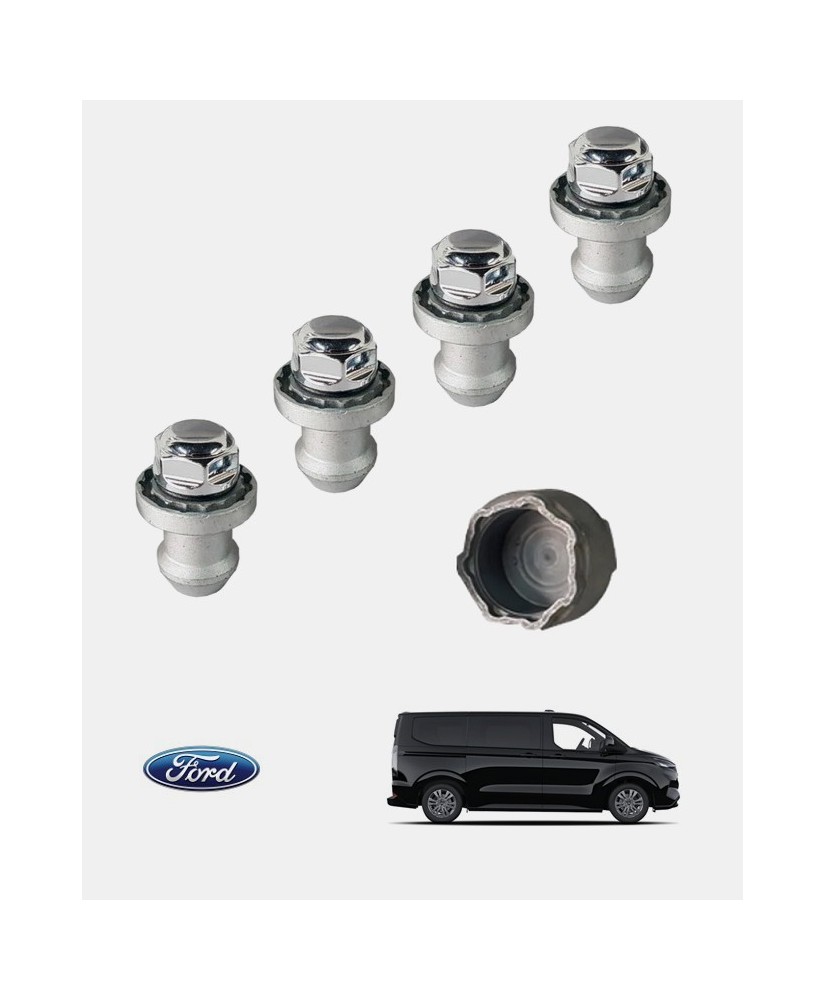 Set de 4 écrous de roues antivol monobloc ultrarésistants à empreintes codées + 1 douille de montage/démontage en acier forgé spécifique à votre Ford Tourneo Custom II 2023, 2024, 2025 et 2026 | Compatible tous modèles, finitions, jantes et motorisations disponibles.