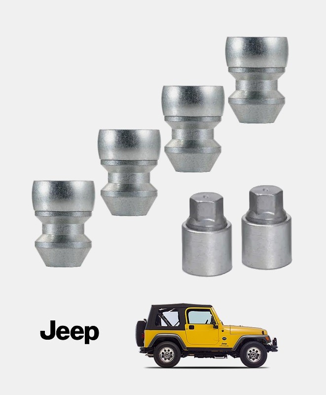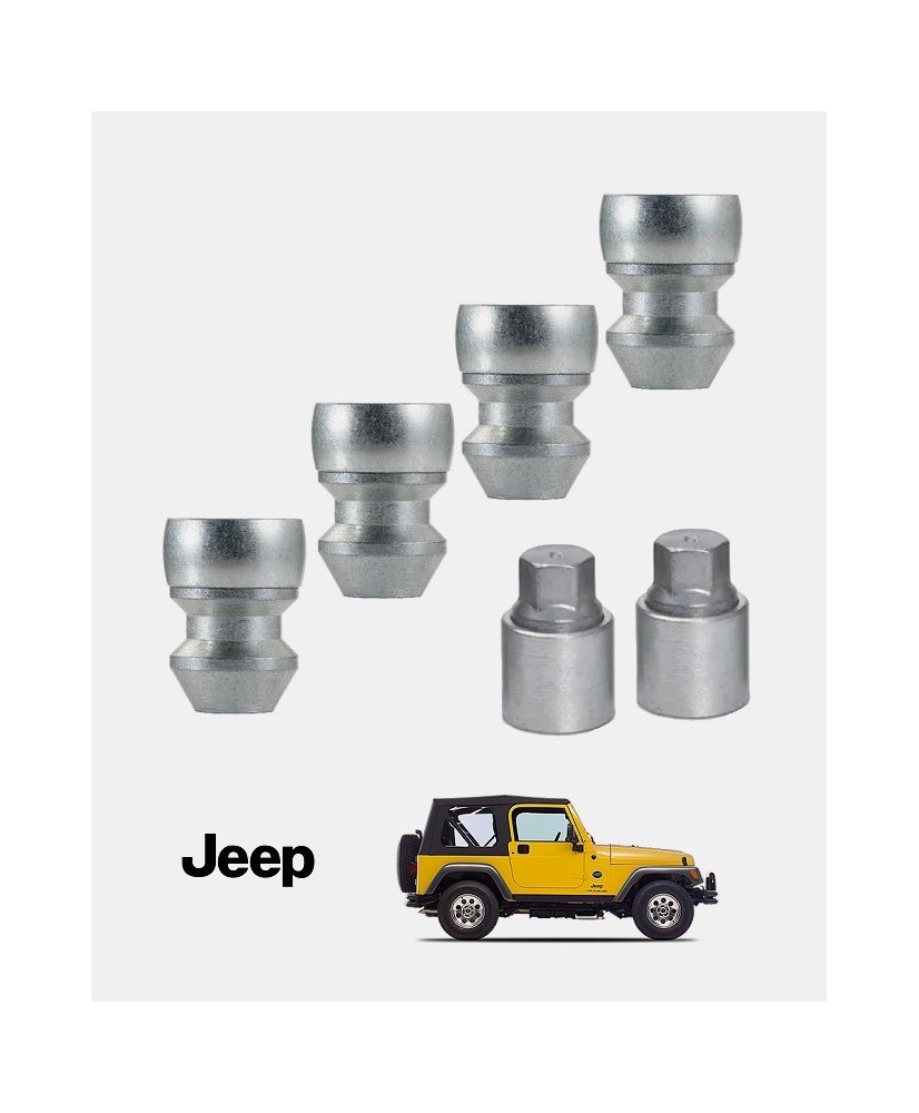 Set de 4 écrous de roues antivol ultrarésistants à empreintes codées (version haute sécurité) + 1 ou 2 douille(s) de montage/démontage en acier forgé à froid spécifique à votre Jeep Wrangler 2 (TJ) 1997, 1998, 1999, 2000, 2001, 2002, 2003, 2004, 2005, 2006 et 2007 | Compatible tous modèles, finitions, jantes et motorisations et disponibles en coloris argent ou noir galvanisé.