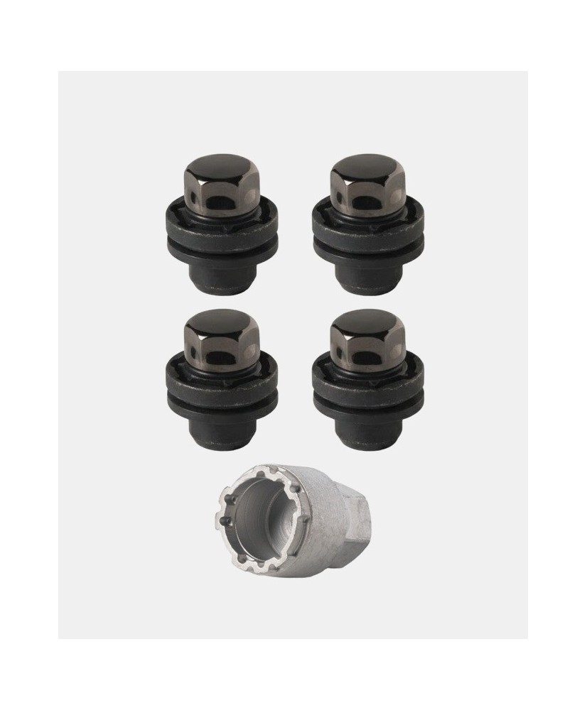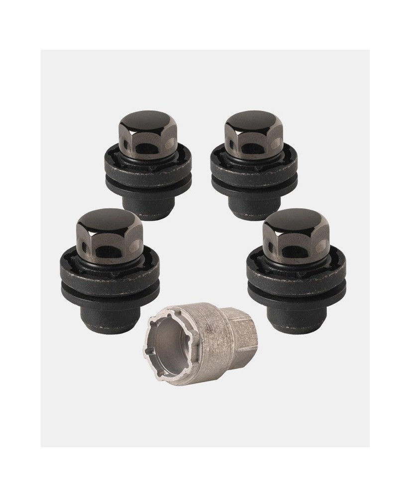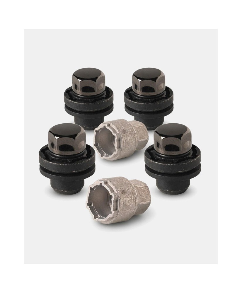Ensemble complet de 4 écrous antivol de roues à empreintes codées ultrarésistants (antivols version haute sécurité) + 1 ou 2 douilles de montage/démontage en acier forgé à froid taille M14X1.5 à assises plates flottantes coloris argent galvanisé ou noir pour Land Rover Defender II 2020, 2021, 2022, 2023, 2024, 2025 et 2026 | Compatible tous modèles de Defender de 2ème génération (L663), finitions, jantes et motorisations disponibles.