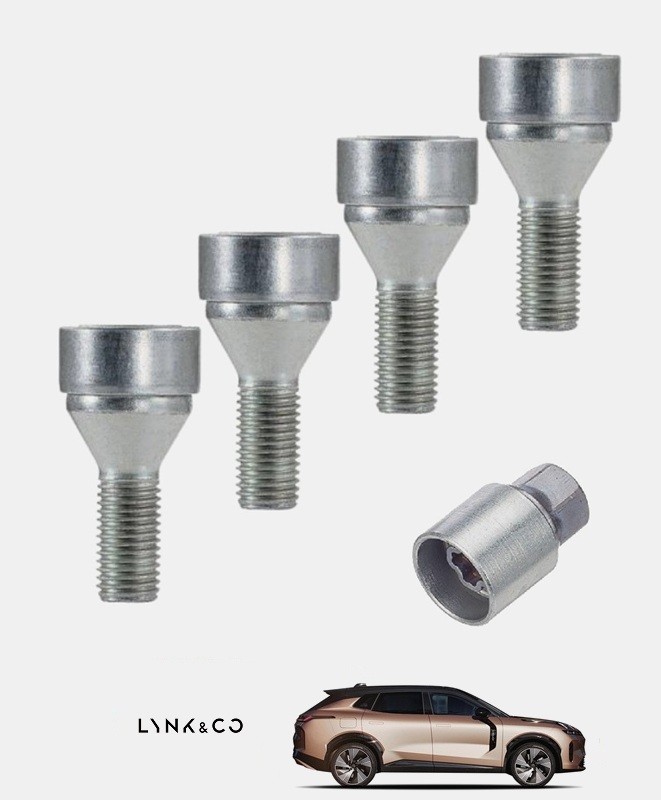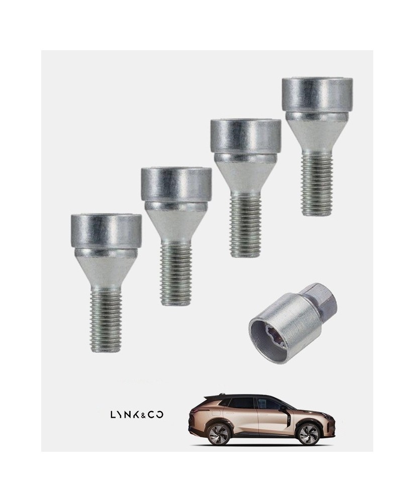 Set de 4 écrous de roues antivol monobloc ultrarésistants à empreintes codées + 1 douille de montage/démontage en acier forgé spécifique à votre Lynk & Co 08 2025 et 2026 | Compatible tous modèles, finitions, jantes et motorisations disponibles.