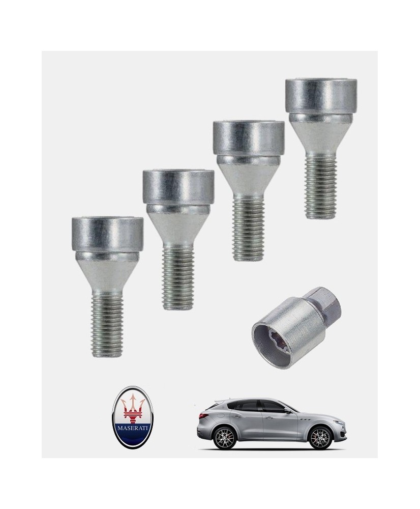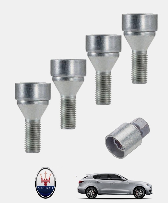 Set de 4 boulons de roues antivol ultrarésistants à empreintes codées (version haute sécurité) + 1 ou 2 douille(s) de montage/démontage en acier forgé à froid spécifique à votre Maserati Levante 2016, 2017, 2018, 2019, 2020, 2021, 2022, 2023, 2024 et 2025 | Compatible tous modèles, finitions, jantes et motorisations et disponibles en coloris argent ou noir galvanisé.