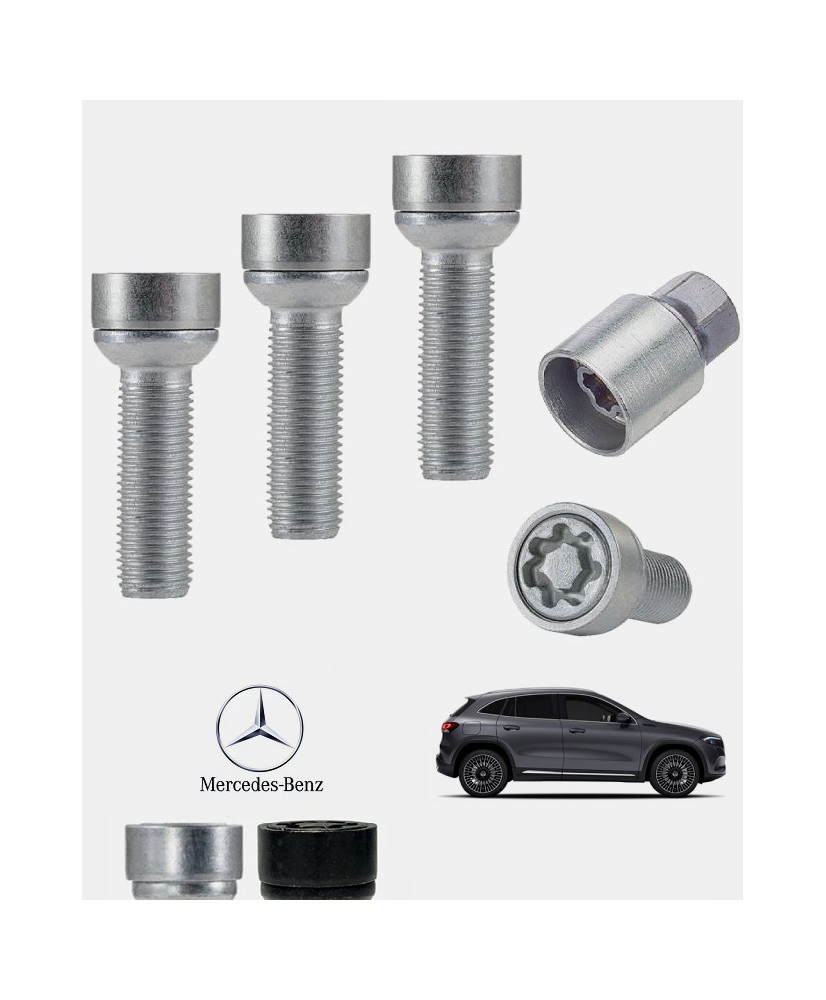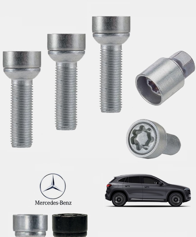Set de 4 boulons de roues antivol ultrarésistants à empreintes codées (version haute sécurité) + 1 ou 2 douille(s) de montage/démontage en acier forgé à froid spécifique à votre Mercedes-Benz EQA 2021, 2022, 2023, 2024, 2025 et 2026 | Compatible tous modèles, finitions, jantes et motorisations et disponibles en coloris argent ou noir galvanisé.