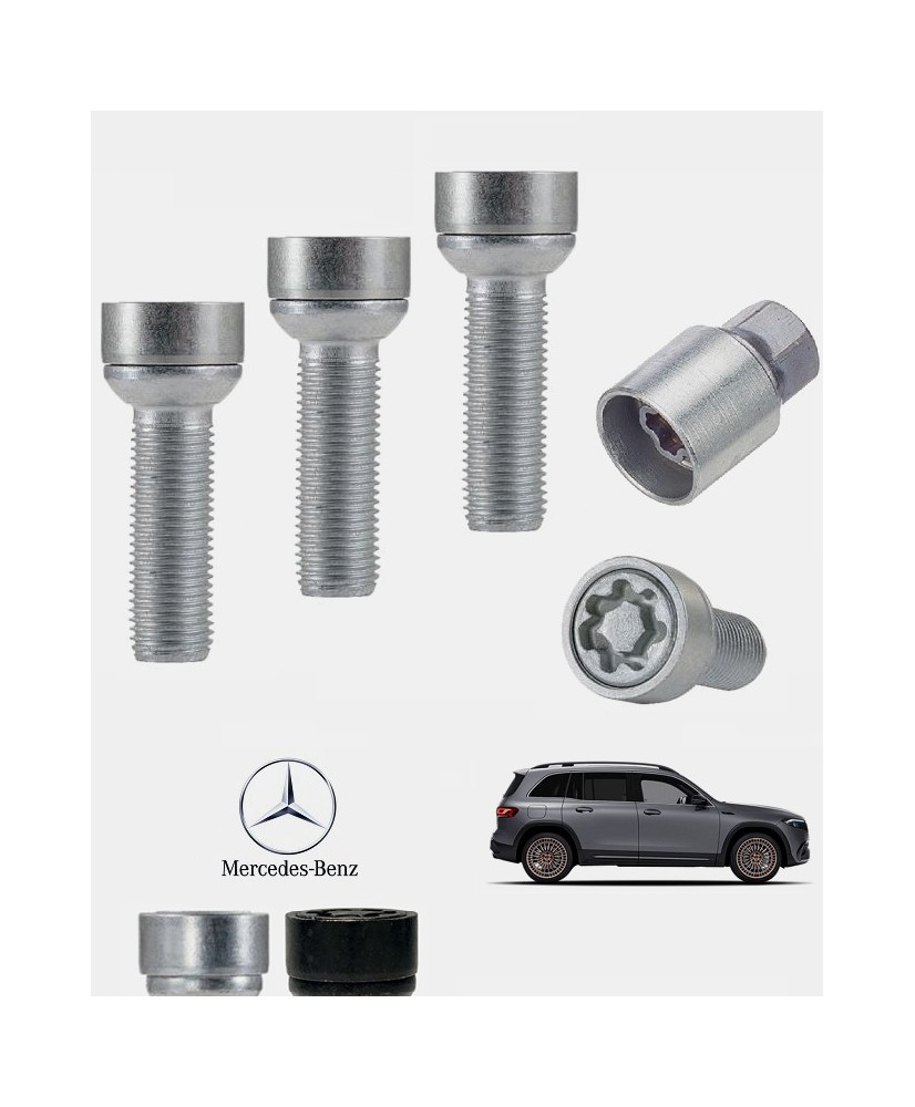 Set de 4 boulons de roues antivol ultrarésistants à empreintes codées (version haute sécurité) + 1 ou 2 douille(s) de montage/démontage en acier forgé à froid spécifique à votre Mercedes-Benz EQB 2021, 2022, 2023, 2024, 2025 et 2026 | Compatible tous modèles, finitions, jantes et motorisations et disponibles en coloris argent ou noir galvanisé.