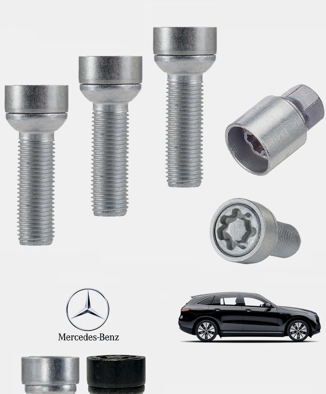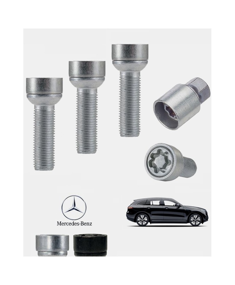 Set de 4 boulons de roues antivol ultrarésistants à empreintes codées (version haute sécurité) + 1 ou 2 douille(s) de montage/démontage en acier forgé à froid spécifique à votre Mercedes-Benz EQC (N293) 2019, 2020, 2021, 2022 et 2023 | Compatible tous modèles, finitions, jantes et motorisations et disponibles en coloris argent ou noir galvanisé.