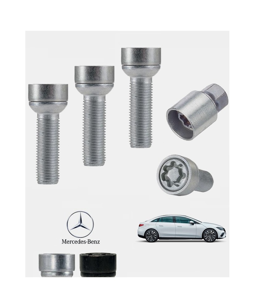 Set de 4 boulons de roues antivol ultrarésistants à empreintes codées (version haute sécurité) + 1 ou 2 douille(s) de montage/démontage en acier forgé à froid spécifique à votre Mercedes EQE et Mercedes-AMG EQE (V295) 2022, 2023, 2024, 2025 et 2026 | Compatible tous modèles, finitions, jantes et motorisations et disponibles en coloris argent ou noir galvanisé.