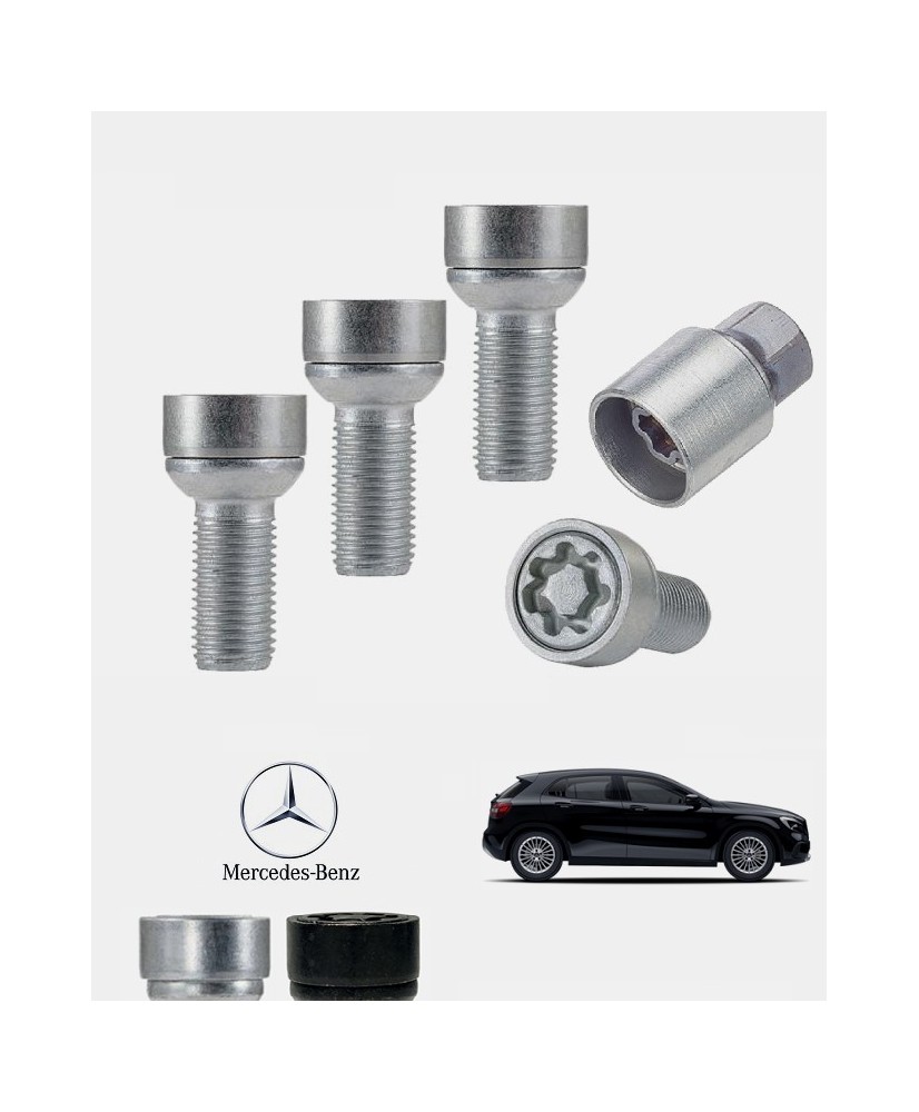 Set de 4 boulons de roues antivol ultrarésistants à empreintes codées (version haute sécurité) + 1 ou 2 douille(s) de montage/démontage en acier forgé à froid spécifique à votre Mercedes-Benz GLA (X156) 2014, 2015, 2016, 2017, 2018, 2019 et 2020 | Compatible tous modèles, finitions, jantes et motorisations et disponibles en coloris argent ou noir galvanisé.
