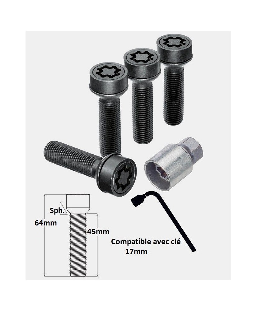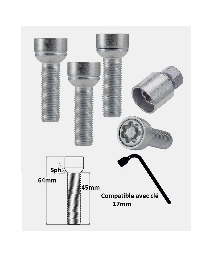 Important: avant le montage de vos nouveaux antivols de roues, vérifiez que les dimensions, le filetage et l'assise de la vis d'origine de votre SUV Mercedes GLC 2 concordent avec ceux de la référence que vous avez réceptionné. Visser la vis antivol à la main sur les premiers tours sans forcer. Ne pas frapper sur la vis antivol, exercez une pression axiale sur la douille de montage et proscrire l'emploi de clef à chocs lors de vos opérations de montage/démontage.