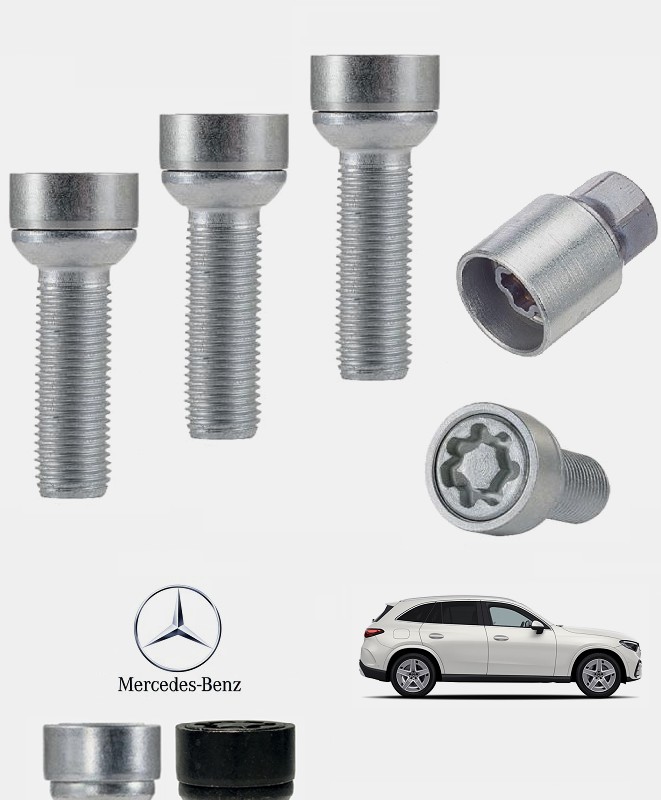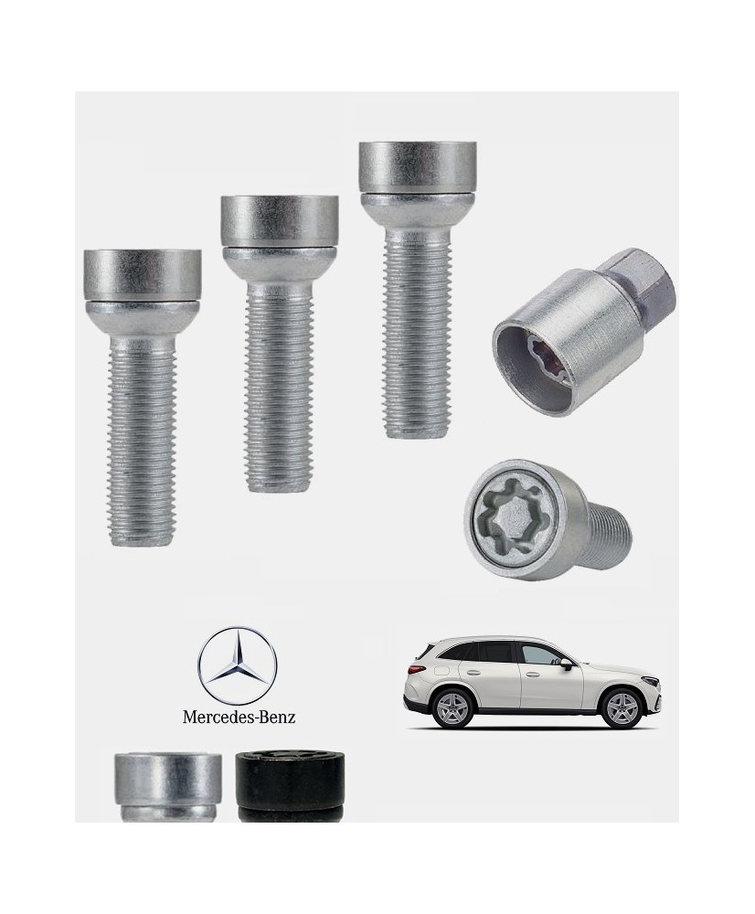 Set de 4 boulons de roues antivol ultrarésistants à empreintes codées (version haute sécurité) + 1 ou 2 douille(s) de montage/démontage en acier forgé à froid spécifique à votre Mercedes-Benz GLC & Mercedes-Benz GLC Coupé (X254/C254) 2022, 2023, 2024, 2025 et 2026 | Compatible tous modèles, finitions, jantes et motorisations et disponibles en coloris argent ou noir galvanisé.