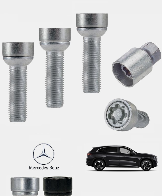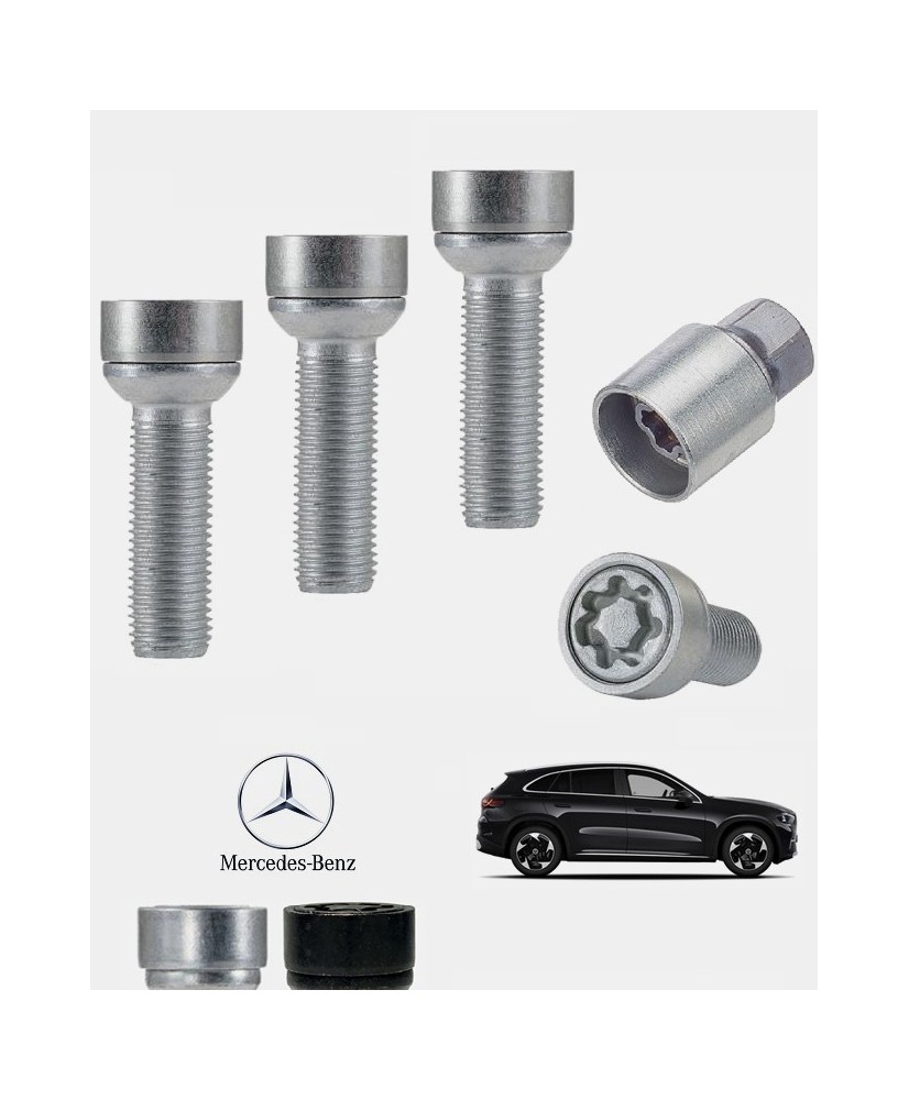 Set de 4 boulons de roues antivol ultrarésistants à empreintes codées (version haute sécurité) + 1 ou 2 douille(s) de montage/démontage en acier forgé à froid spécifique à votre Mercedes-Benz GLC EQ Technology 2025 et 2026 | Compatible tous modèles, finitions, jantes et motorisations et disponibles en coloris argent ou noir galvanisé.
