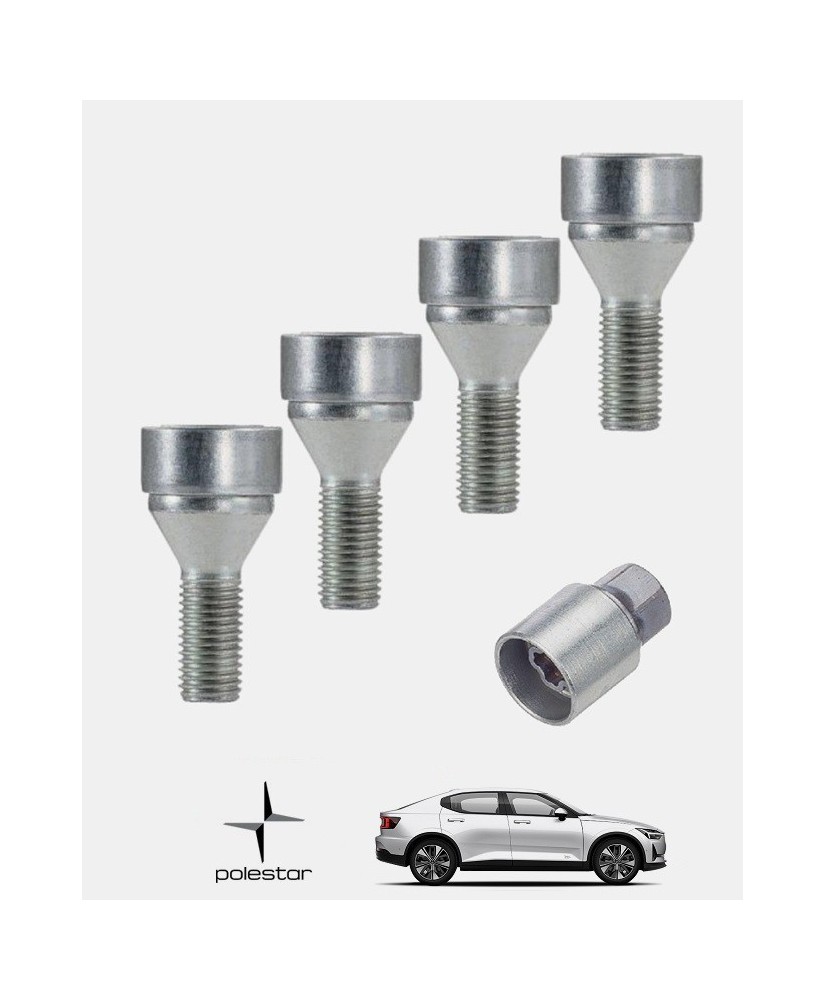 Set de 4 écrous de roues antivol monobloc ultrarésistants à empreintes codées + 1 douille de montage/démontage en acier forgé spécifique à votre Polestar 2 2020, 2021, 2022, 2023, 2024 et 2025 | Compatible tous modèles, finitions, jantes et motorisations. Disponibles en coloris argent ou noir galvanisé.