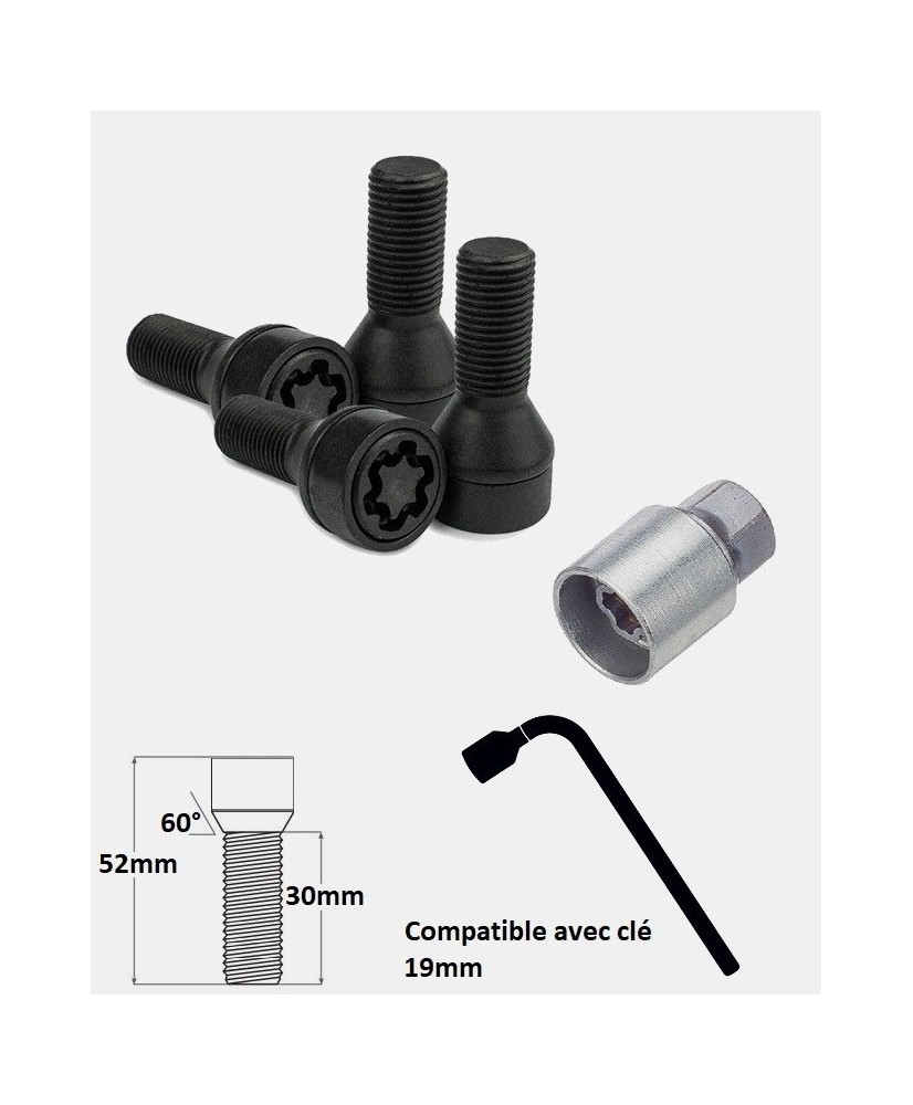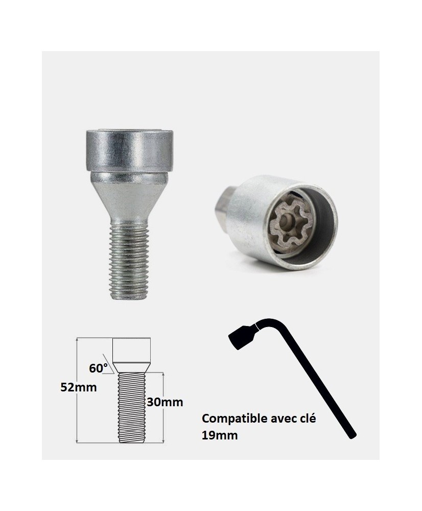 | Contenu | 4 boulons antivols codés (haute sécurité) + 1 ou 2 clef(s) de montage/démontage + 1 coffret de rangement + 1 sticker mémo avec numéro d'empreinte |