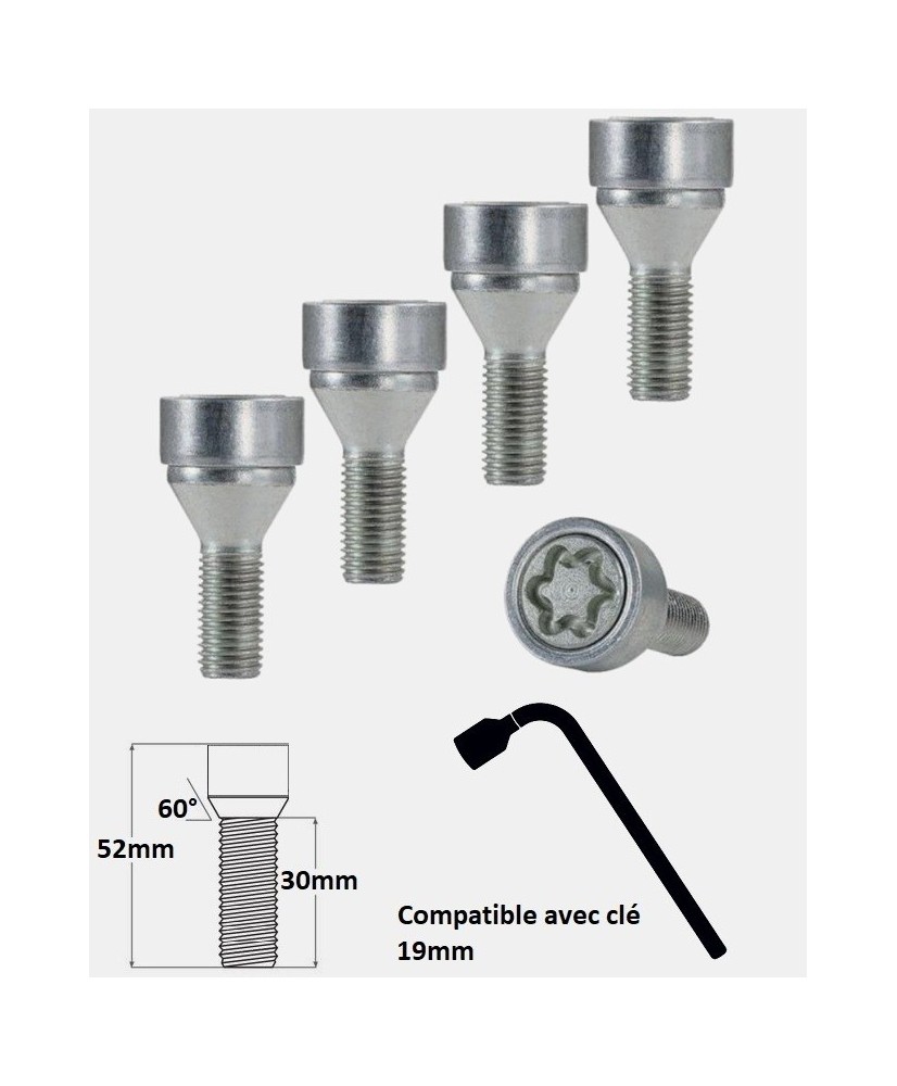 | Contenu | 4 boulons antivols codés (haute sécurité) + 1 ou 2 clef(s) de montage/démontage + 1 coffret de rangement + 1 sticker mémo avec numéro d'empreinte |