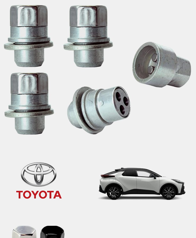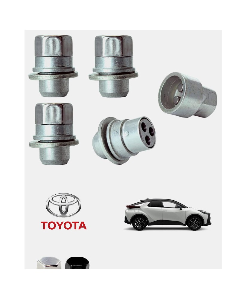 Ensemble complet de 4 écrous de roues antivol à empreintes codées ultrarésistants (version haute sécurité) + 1 ou 2 douilles de montage/démontage en acier forgé à froid taille M12X1.5 à assises plates + 4 caches écrous en coloris argent galvanisé ou noir + 1 extracteur pour Toyota CH-R 2 (AX20) 2023, 2024 et 2025 | Compatible tous modèles, finitions, jantes et motorisations.