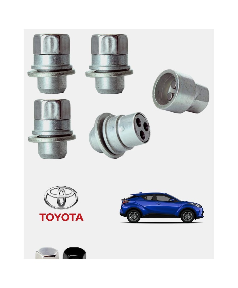 Ensemble complet de 4 écrous de roues antivol à empreintes codées ultrarésistants (version haute sécurité) + 1 ou 2 douilles de montage/démontage en acier forgé à froid taille M12X1.5 à assises plates + 4 caches écrous en coloris argent galvanisé ou noir + 1 extracteur pour Toyota CH-R (AX10) 2016, 2017, 2018, 2019, 2020, 2021, 2022 et 2023 | Compatible tous modèles, finitions, jantes et motorisations.