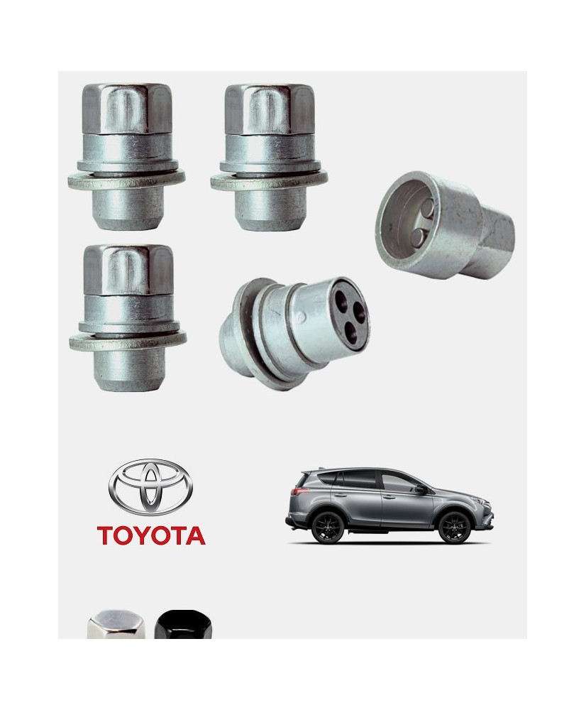 Ensemble complet de 4 écrous de roues antivol à empreintes codées ultrarésistants (version haute sécurité) + 1 ou 2 douilles de montage/démontage en acier forgé à froid taille M12X1.5 à assises plates + 4 caches écrous en coloris argent galvanisé ou noir + 1 extracteur pour Toyota RAV 4 MKV (XA50) 2019, 2020, 2021, 2022, 2023, 2024 et 2025 | Compatible tous modèles, finitions, jantes et motorisations.