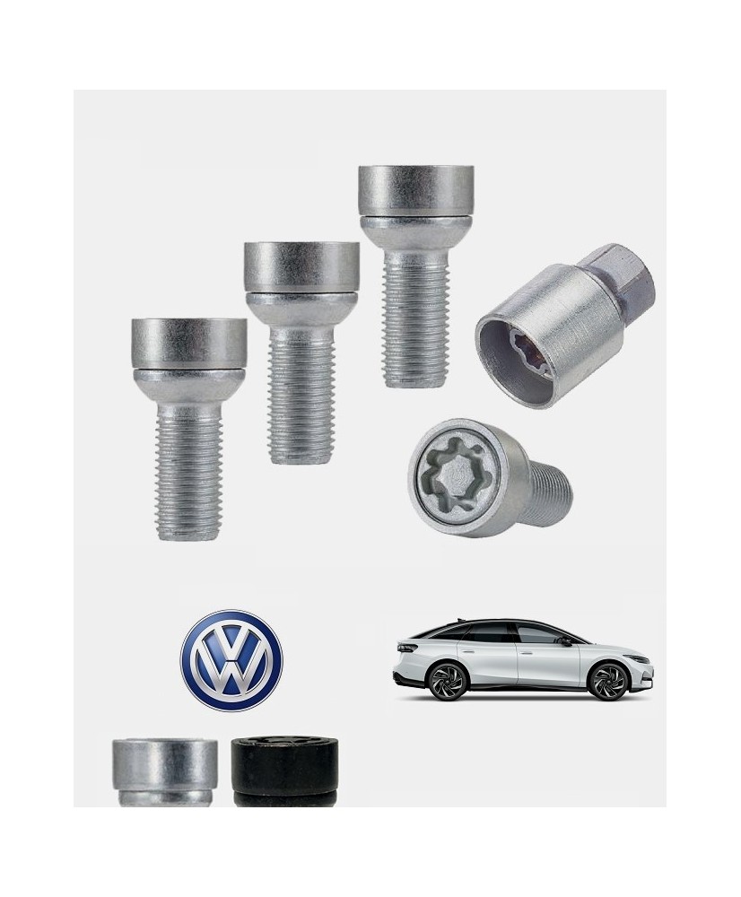 Set de 4 boulons de roues antivol ultrarésistants à empreintes codées (version haute sécurité) + 1 ou 2 douille(s) de montage/démontage en acier forgé à froid spécifique à votre Volkswagen ID.7 et ID.7 Tourer de 2023, 2024, 2025 et 2026 | Compatible tous modèles, finitions, jantes et motorisations et disponibles en coloris argent ou noir galvanisé.
