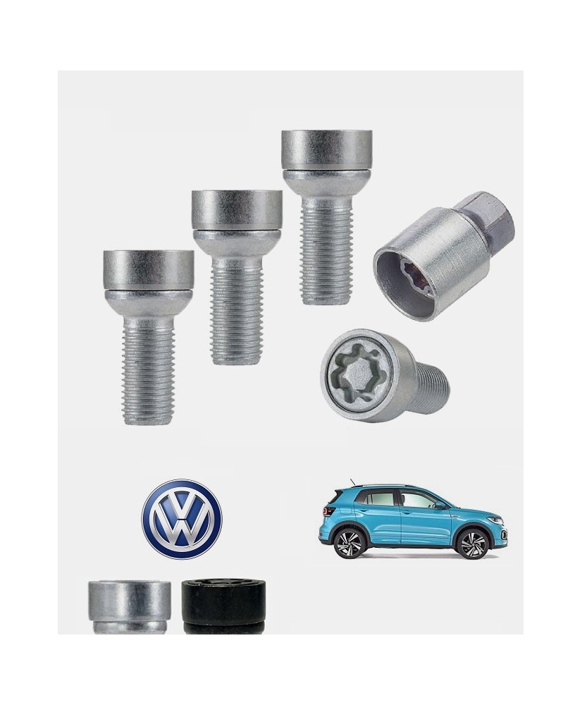 Set de 4 boulons de roues antivol ultrarésistants à empreintes codées (version haute sécurité) + 1 ou 2 douille(s) de montage/démontage en acier forgé à froid spécifique à votre Volkswagen T-Cross 2019, 2020, 2021, 2022, 2023, 2024, 2025 et 2026 | Compatible tous modèles, finitions, jantes et motorisations et disponibles en coloris argent ou noir galvanisé.