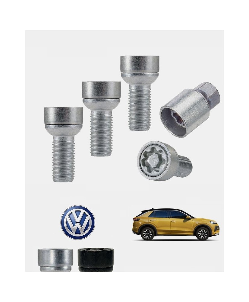 Set de 4 boulons de roues antivol ultrarésistants à empreintes codées (version haute sécurité) + 1 ou 2 douille(s) de montage/démontage en acier forgé à froid spécifique à votre Volkswagen T-Roc II 2025 et 2026 | Compatible tous modèles, finitions, jantes et motorisations et disponibles en coloris argent ou noir galvanisé.