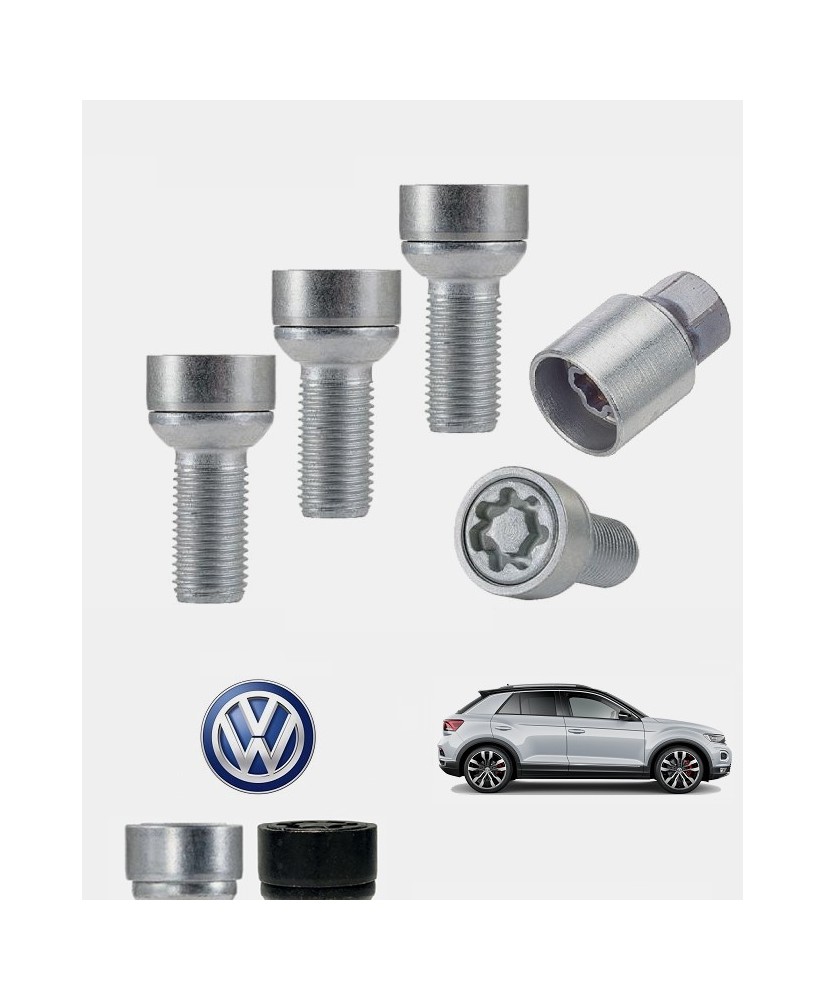 Set de 4 boulons de roues antivol ultrarésistants à empreintes codées (version haute sécurité) + 1 ou 2 douille(s) de montage/démontage en acier forgé à froid spécifique à votre Volkswagen T-Roc 2018, 2019, 2020, 2021, 2022, 2023, 2024 et 2025 | Compatible tous modèles, finitions, jantes et motorisations et disponibles en coloris argent ou noir galvanisé.
