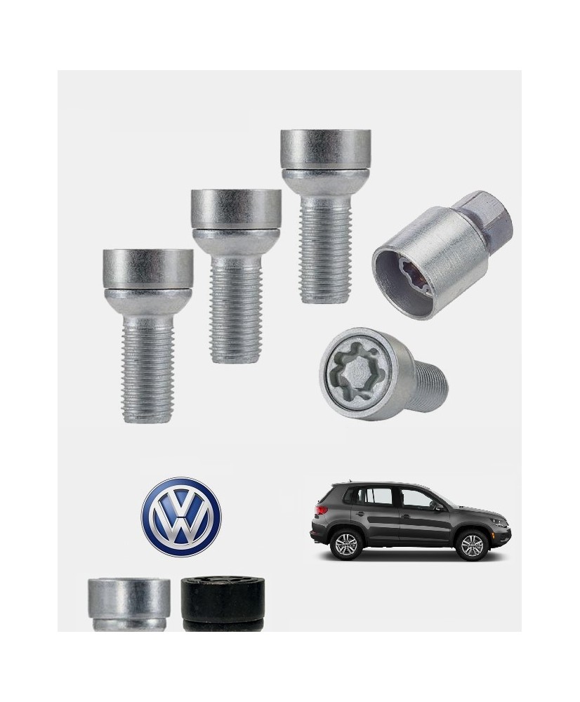 Set de 4 boulons de roues antivol ultrarésistants à empreintes codées (version haute sécurité) + 1 ou 2 douille(s) de montage/démontage en acier forgé à froid spécifique à votre Volkswagen TIGUAN (5N) de 2007, 2008, 2009, 2010, 2011, 2012, 2013, 2014, 2015 et 2016 | Compatible tous modèles, finitions, jantes et motorisations et disponibles en coloris argent ou noir galvanisé.