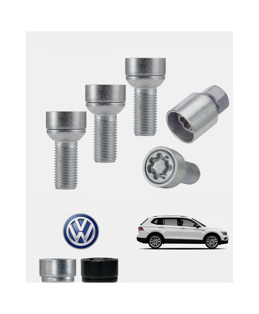 Set de 4 boulons de roues antivol ultrarésistants à empreintes codées (version haute sécurité) + 1 ou 2 douille(s) de montage/démontage en acier forgé à froid spécifique à votre Volkswagen TIGUAN 2 (5P) de 2016, 2017, 2018, 2019, 2020, 2021, 2022 et 2023 | Compatible tous modèles, finitions, jantes et motorisations et disponibles en coloris argent ou noir galvanisé.