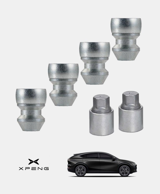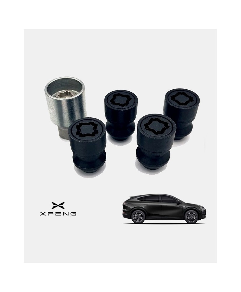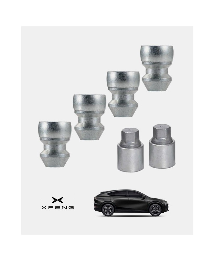 Set de 4 écrous de roues antivol ultrarésistants à empreintes codées (version haute sécurité) + 1 ou 2 douille(s) de montage/démontage en acier forgé à froid spécifique à votre XPENG G6 2024, 2025 et 2026 | Compatible tous modèles, finitions, jantes et motorisations et disponibles en coloris argent ou noir galvanisé.