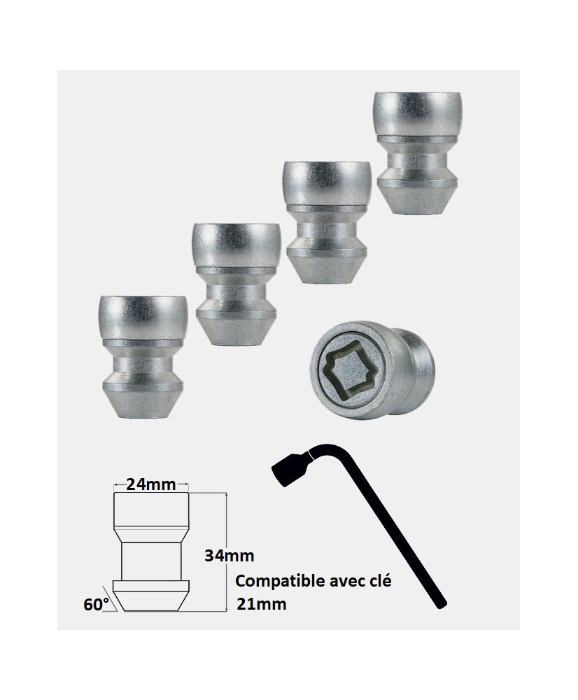 | Contenu | 4 écrous antivols codés (haute sécurité) + 1 ou 2 clef(s) de montage/démontage + 1 coffret de rangement + 1 sticker mémo avec numéro d'empreinte |